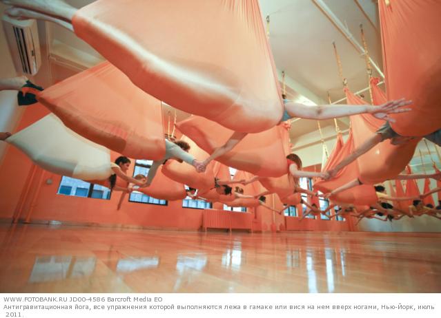 All the rage among American fans of fitness the so called anti-gravity yoga exercises all of which are performed in a silk hammock. There are two variants of body position - lying flat or hanging upside down. Christopher Harrison, the creator of the trend is convinced that such a body position helps develop a sense of balance and relax the spine after excessive stress.
